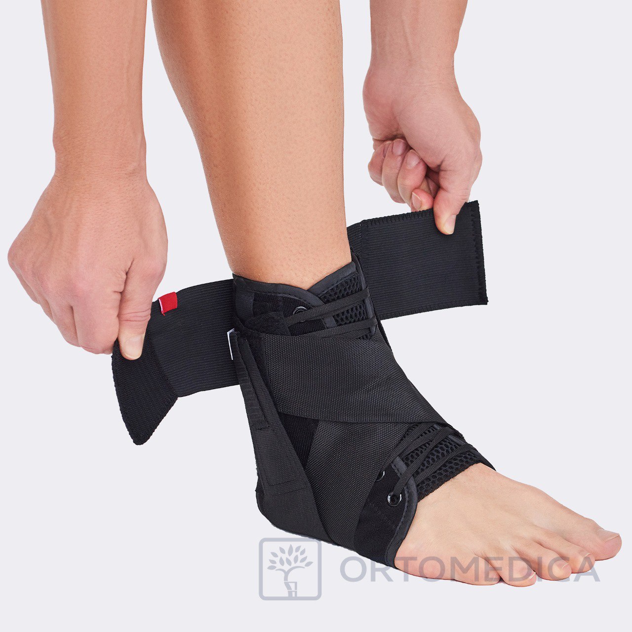 - 2. Зашнуруйте ортез:потяните с двух сторон фиксирующие шнурки. Закрепите крест накрест с внешней стороны ортеза с помощью застежек велкро.